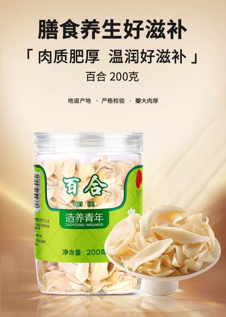 百合:口感粉糯,肉质肥厚,自然香甜,无添加更安心。