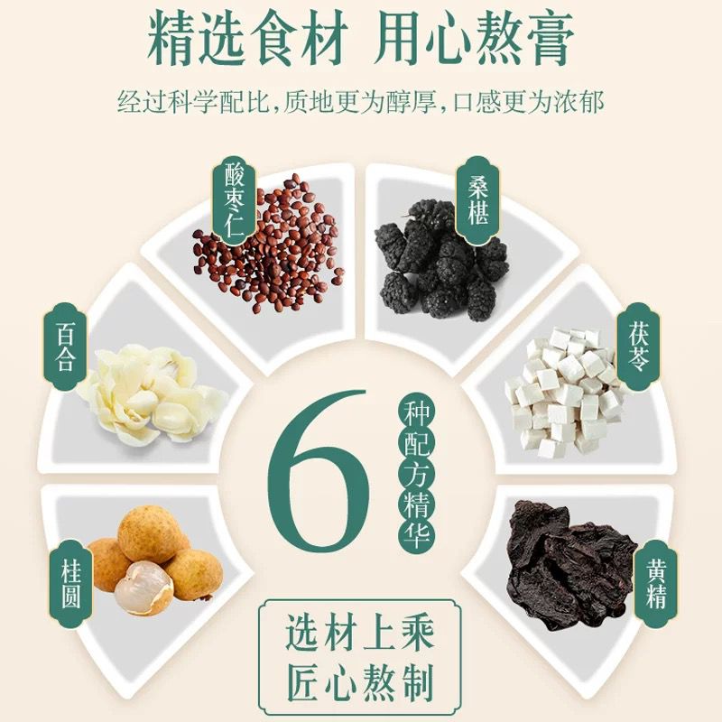 Honey, mulberry, poria, longan, spine date seed (9.7%), lily bulb, polygonatum, purified water, ejiao, buckwheat vinegar (brewed vinegar)